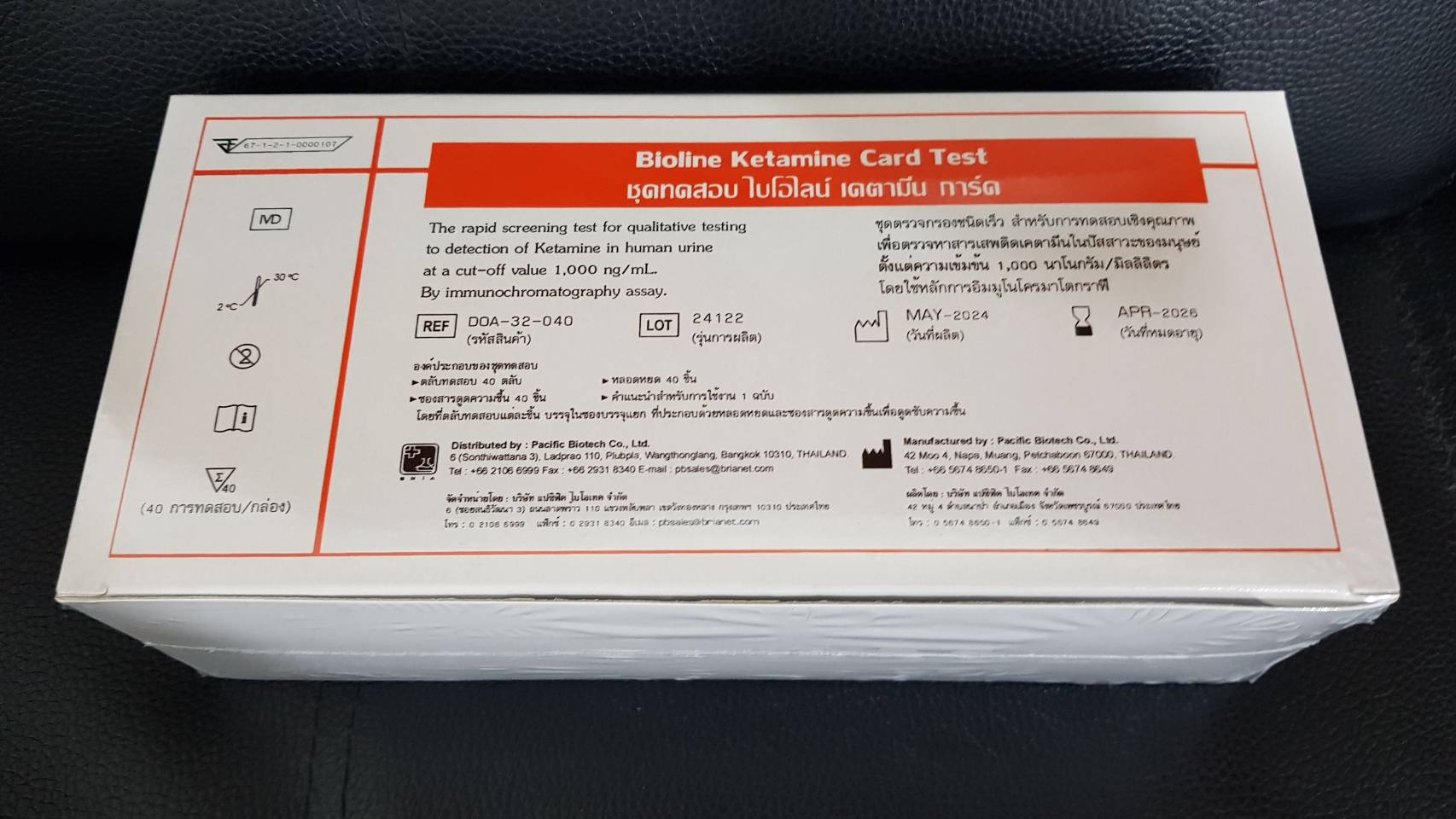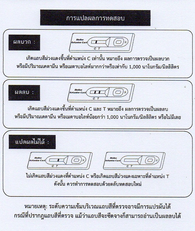 - การใช้ชุดทดสอบนี้เป็นการตรวจหาสารเบื้องต้นเท่านั้น ทั้งนี้ต้องได้รับการตรวจยืนยันผลอีกครั้ง